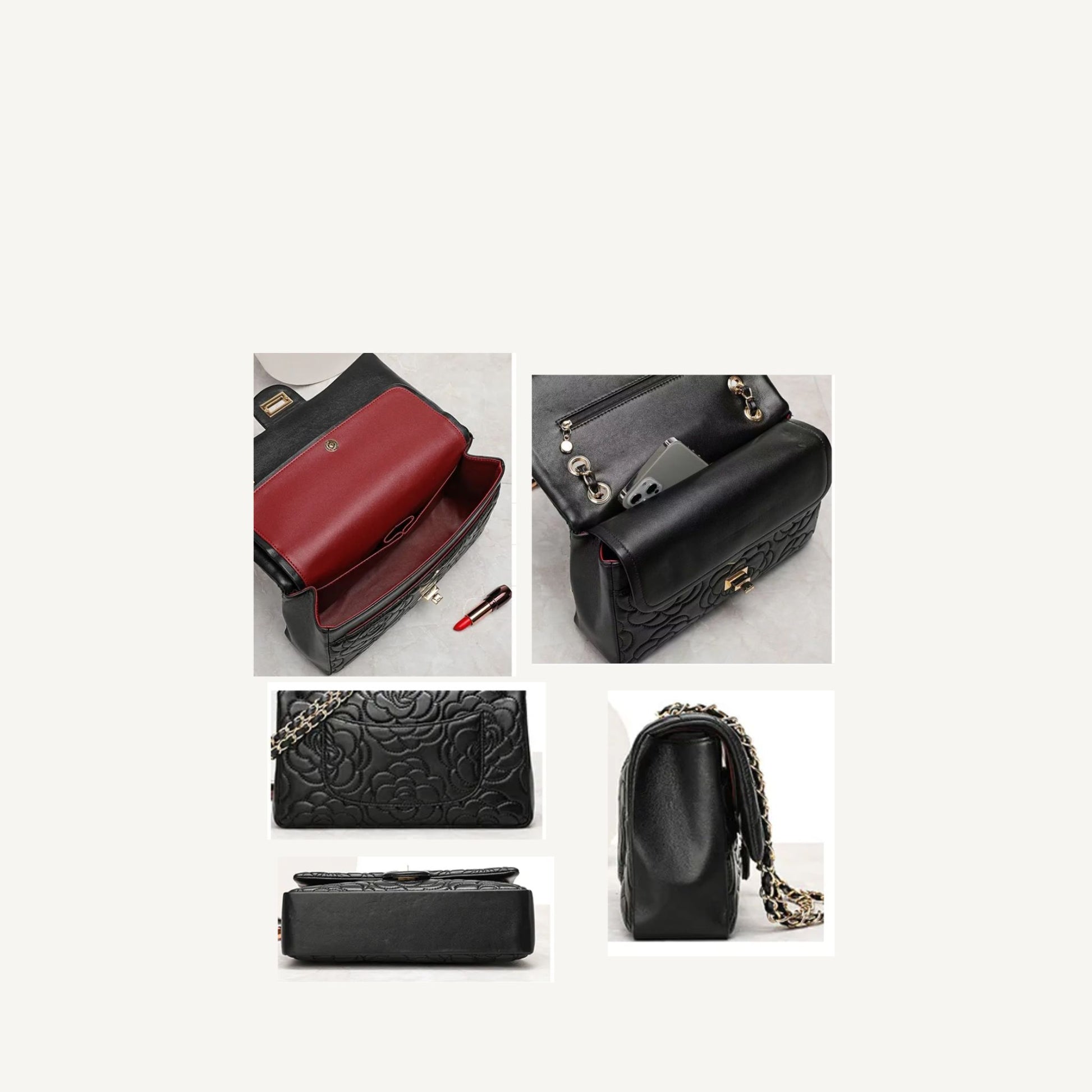 Made of genuine leather, features high-quality hardware, a chain link shoulder strap, and a flap opening with a turn lock closure. Its interior includes a zipped pocket under the flap, a front open pocket, and two slip pockets. This bag combines elegance, practicality, and attention to detail. Whether you’re heading to a special event or simply need a reliable accessory, it’s a versatile choice!
