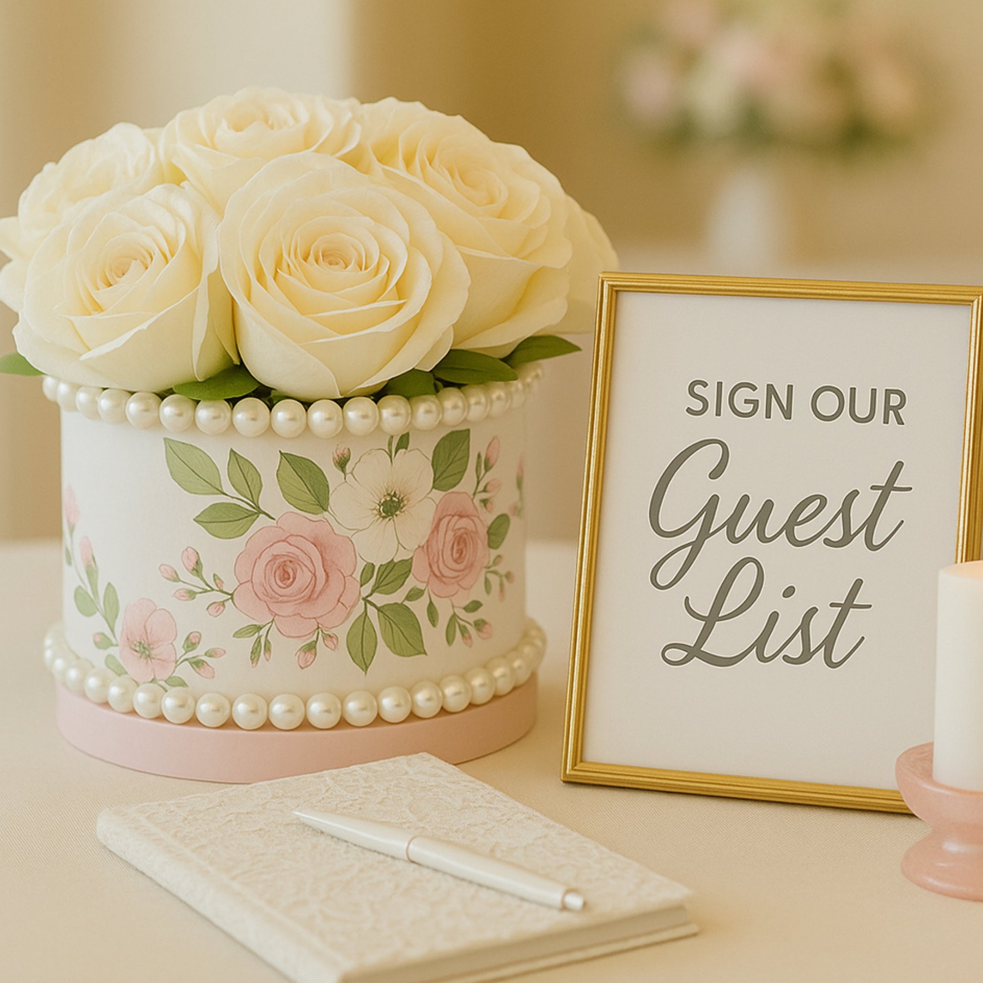 This exquisite flower box features a charming cottage-style design, adorned with delicate printed flowers. The box is beautifully embellished with ivory artificial flowers, interspersed with elegant pearls. Perfect for a sophisticated, yet cozy wedding, this flower box adds a touch of timeless elegance to your decor.