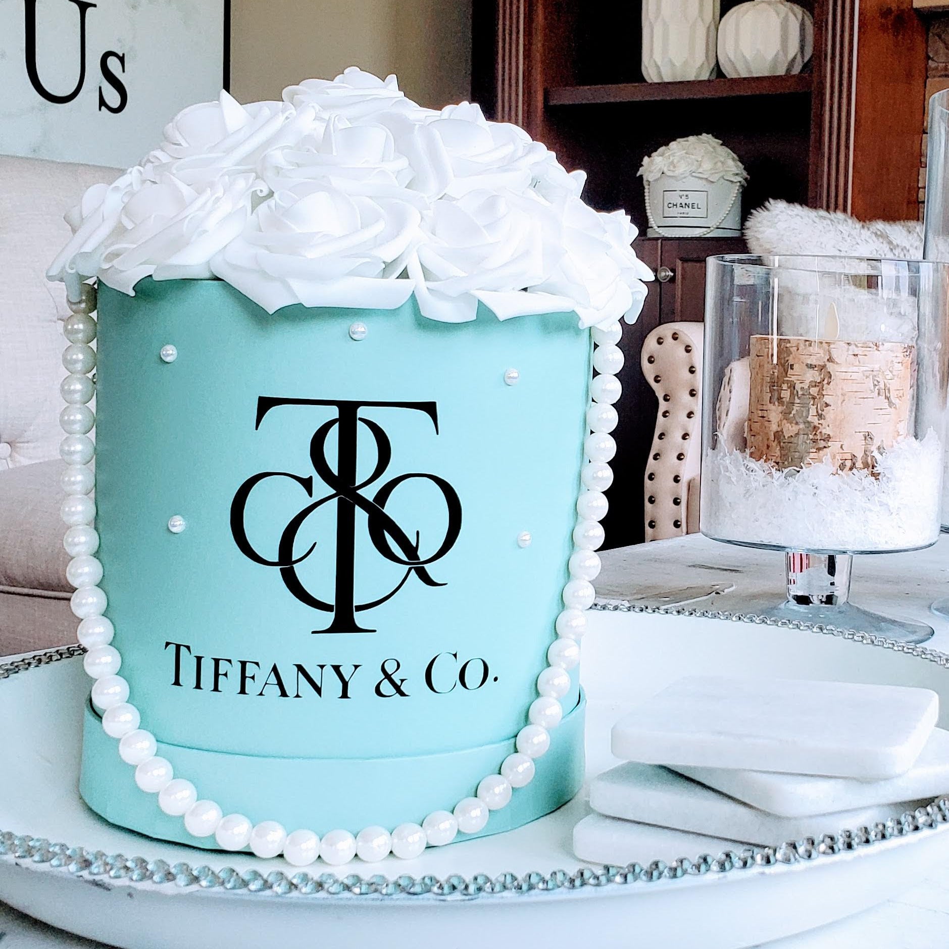 Elegant Tiffany inspired flower box features white artificial roses, a delicate pearl necklace, and scattered pearls. It is crafted with permanent vinyl. Beautiful addition to  your home or office decoration.